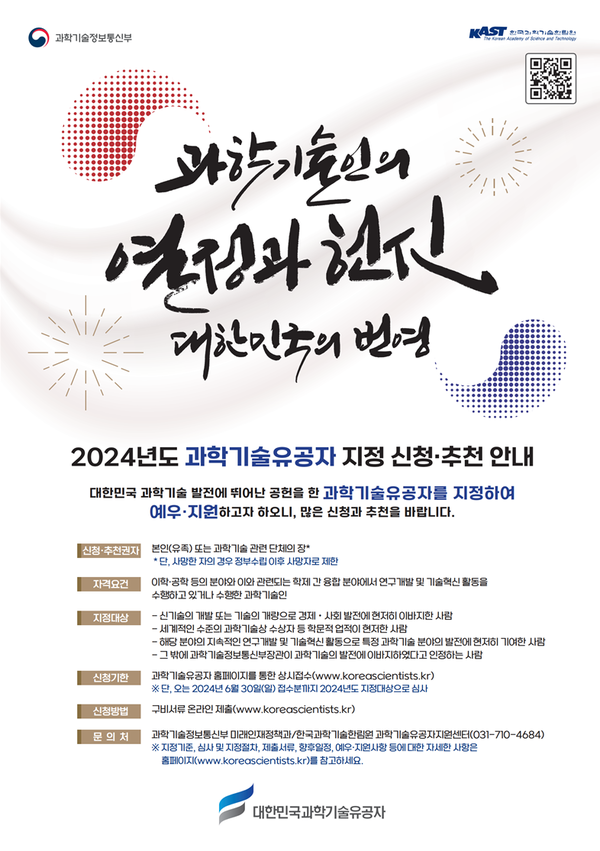 과학기술정보통신부(장관 이종호, 이하 ‘과기정통부’)는 ’24년 4월 30일 대한민국 과학기술 발전에 공헌한 과학기술유공자 지정을 위해「2024년도 과학기술유공자 지정계획」을 공고한다.