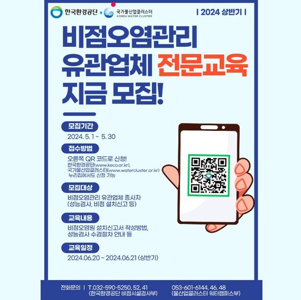 [디지털비즈온 이은광 기자] 환경부 산하 한국환경공단(이사장 안병옥)은 ‘24년 비점오염관리 유관업체 역량강화 전문교육’ 과정을 신설하고 교육과정에 참여할 상반기 교육생을 5월30일까지 모집한다.