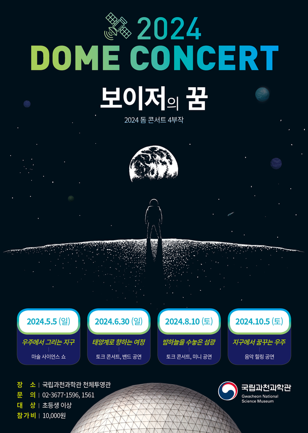 국립과천과학관(관장 한형주)은 오늘 5월 5일(일)을 시작으로 2024 돔 콘서트 ‘보이저의 꿈’ 4부작을 개최한다고 밝혔다. 올해 돔 콘서트는 5월부터 10월까지 총 4회 진행되며, 시의성 있는 주제를 마술, 강연, 음악 등 다양한 형태의 공연으로 즐길 수 있도록 구성하였다.