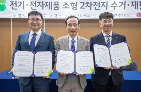 [디지털비즈온 이은광 기자] 환경부 산하 한국환경공단(이사장 안병옥)은 7일 LG전자, E-순환거버넌스와 경남 창원 LG스마트파크2에서 ‘전기․전자제품 소형 2차전지 수거․재활용 업무협약’을 체결했다고 밝혔다.