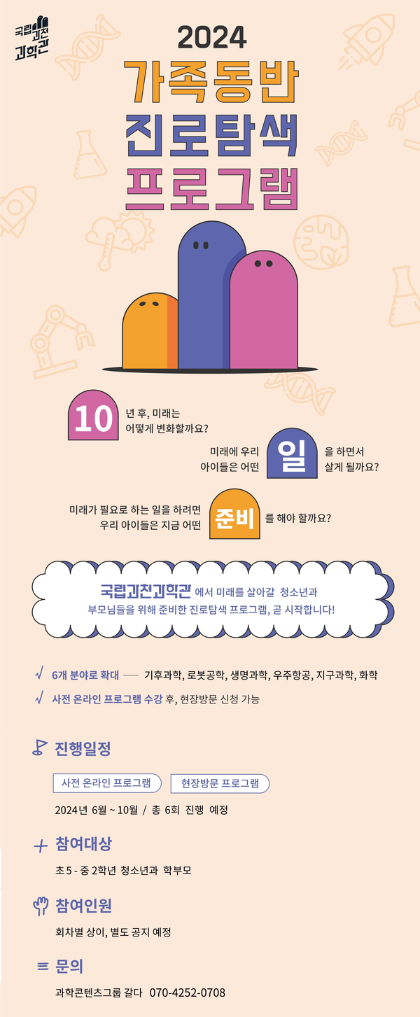 국립과천과학관(관장 한형주)은 작년에 이어 올해 6월부터 10월까지 청소년과 학부모를 대상으로 「2024 가족동반 진로탐색 프로그램」을 운영한다.