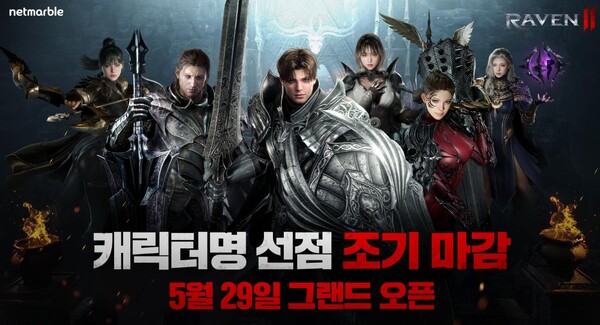 [디지털비즈온 이현주 기자] 넷마블(대표 권영식, 김병규)은 오는 29일 출시를 앞둔 블록버스터 신작 MMORPG ‘레이븐2’의 2차 캐릭터명 선점 이벤트가 성황리에 마감됐다고 21일 밝혔다.