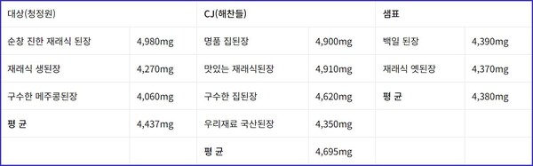 CJ 해찬들 된장 4개 제품의 100g당 평균 나트륨 함량이 4,700mg으로 일일 권장량 2,000mg의 두 배를 넘었다. 단일 된장 제품 중 나트륨 함량이 가장 높은 것은 대상 ‘진한 재래식 된장’(4,980mg)으로 나타났다.