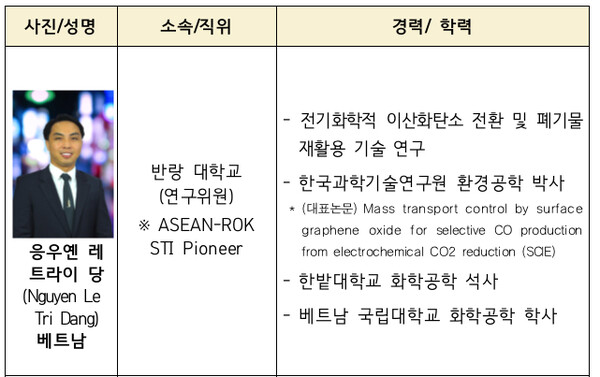 응우옌 레 트라이 당 연구원은 전기화학적 이산화탄소 전환 및 폐기물 재활용 기술 연구로 주목받는 환경공학자로, 한국과학기술연구원(KIST) 파트너십 프로젝트(Partnership Project) 등 한국과의 지속적인 공동연구를 통해 다양한 성과를 도출하며 협력의 모범 사례를 만들어 가고 있다.