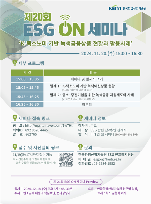 [디지털비즈온 이은광 기자] 한국환경산업기술원은 오는 20일 ‘제20회 이에스지(ESG) 온(ON) 세미나’를 열고, 한국형 녹색분류체계에 기반한 녹색금융상품의 동향과 우리 기업의 사업장 저탄소화를 위한 녹색금융 활용 방안을 논의한다.