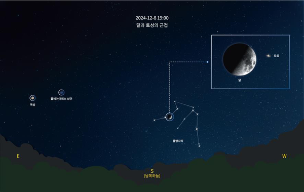 국립과천과학관(관장 한형주)은 ‘달·토성 근접 특별관측회’를 12월 8일(일)에 국립과천과학관에서 개최한다고 밝혔다. 이번 달·토성 근접은 서울에서 맨눈으로 관측가능한 것을 기준으로, 1974년 2월 4일 이후 50년 만에 최대로 가까워지는 것이며, 다음에는 2075년 8월 20일이 되어야 달과 토성이 이번만큼이나 가까워 보인다. 이번 근접에서 달과 토성과의 거리는 0.3도이다. 보름달의 시직경*이 0.5도이므로 달과 토성이 보름달의 시직경보다 서로 가깝게 위치한다.
