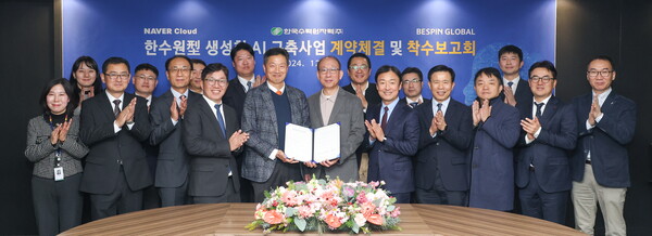 한국수력원자력(사장 황주호, 이하, 한수원)이 11일 네이버클라우드(대표 김유원), 베스핀글로벌(대표 장인수)과 서울 한수원 방사선보건원에서 ‘한수원型(형) 생성형 AI 구축 사업’ 계약을 체결하고 인공지능 구축 사업에 착수했다.
