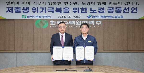 한국수력원자력(사장 황주호, 이하 한수원)과 한수원 노동조합(위원장 최영두)이 17일 서울 한수원 방사선보건원에서 ‘저출생 위기 극복을 위한 노경 공동선언식’을 개최했다.