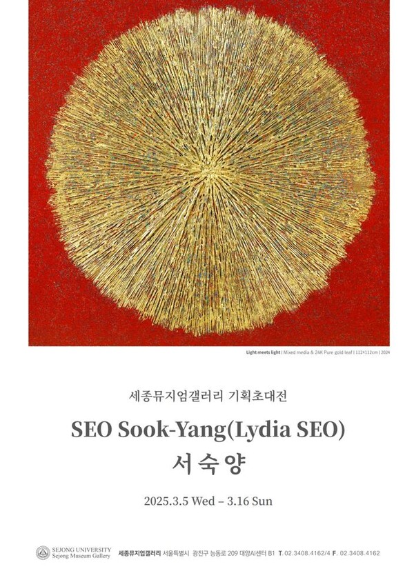 세종대학교(총장 엄종화) 세종뮤지엄갤러리 1관은 3월 5일부터 16일까지 순금 금박을 활용한 회화 작업으로 삶의 희망과 생명의 빛을 표현하는 서숙양 작가의 기획초대전을 개최한다.