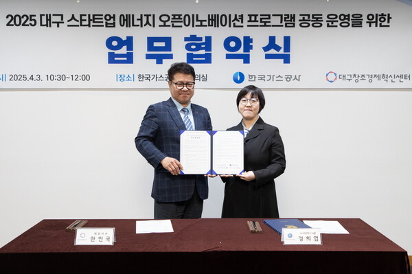 한국가스공사(사장 최연혜)는 4월 3일 대구 본사에서 대구창조경제혁신센터(대표이사 한인국)와 ‘에너지 오픈이노베이션 지원 사업 업무 협약’을 체결했다고 4일 밝혔다.