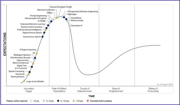 [디지털비즈온 이호선 기자] 가트너가 2024년 신기술 하이프 사이클(Hype Cycle for Emerging Technologies) 보고서에서 주목해야 할 25가지의 혁신 기술을 21일 발표했다.이 기술들은 ▲자율형 AI ▲개발자 생산성 ▲전체적 경험 ▲인간 중심의 보안 및 개인정보 보호 프로그램 등 네 가지 주요 트렌드로 분류된다고 소개했다.가트너가 매년 프로파일링하는 2,000개 이상의 기술 및 응용 프레임워크에서 핵심적인 인사이트를 도출하여, 반드시 알아야 할 떠오르는 기술들을 간결하게 정리하여 제시하기 때문이다.가트너