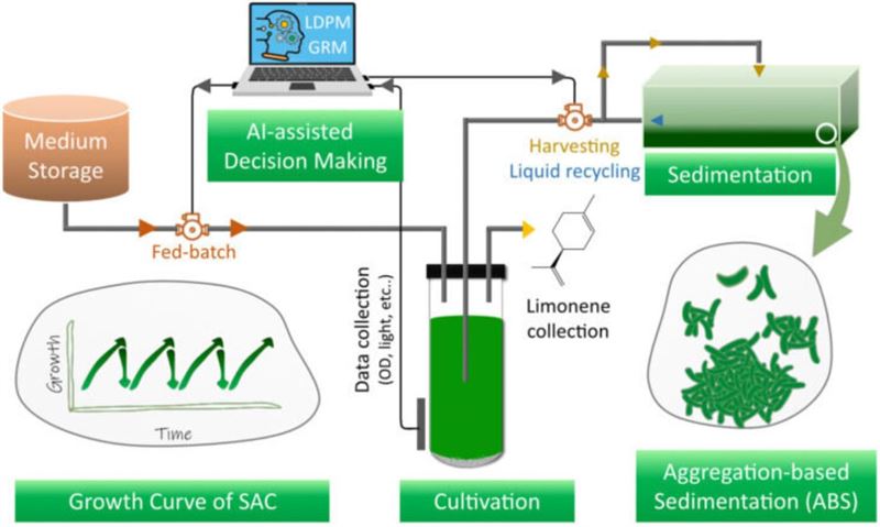 바이오 연료 생산을 위한 기계 학습 정보 반연속 조류 배양(SAC)과 응집 기반 침전(ABS)의 통합을 보여줍니다. (자료= 텍사스 A&M AgriLife Research)