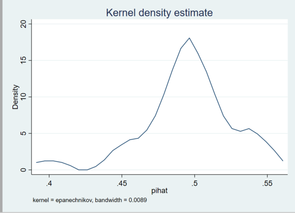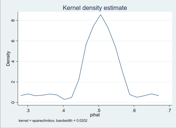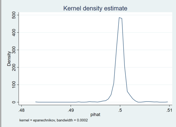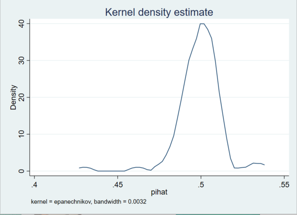 표본의 갯수가 너무 적은 탓인지, 정규분포와는 조금 거리가 먼 모양입니다. 무엇보다도 그래프의 고점이 평균인 0.5보다 작은 모양새입니다. 고점을 중심으로 그래프의 좌우도 모양이 다릅니다.