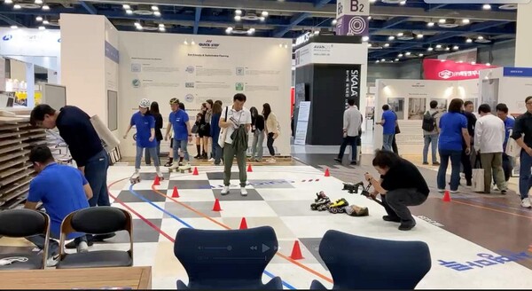퀵스텝은 뛰어난 내구성과 완벽에 가까운 스크래치 방지 기술을 자랑하며, 이를 전시장에서 직접 롤러스케이트를 타며 표면강도에 대한 월등한 기술력을 보여주고 있다.