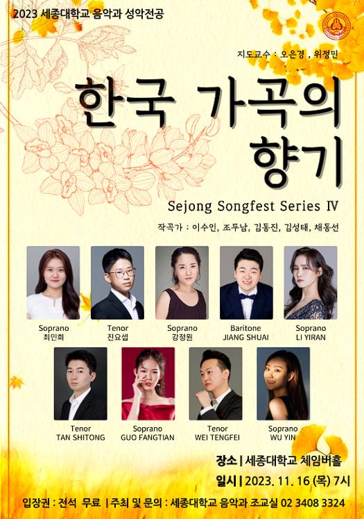 특히 이번 Sejong Songfest Series IV 연주회에서는 대중적인 한국 서정 가곡을 작곡한 이수인, 조두남, 채동선, 김동진, 김성태 작곡가의 작품을 통해 관객들과 함께 세종대의 멋진 가을을 향유할 예정이다.