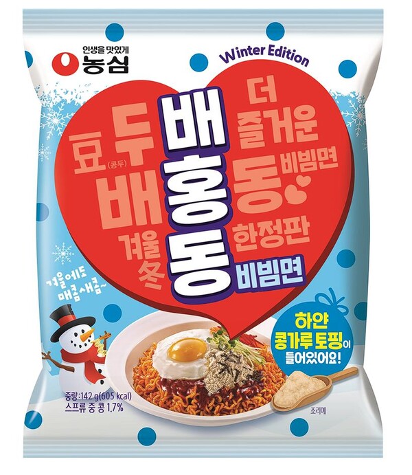 [디지털비즈온 이은광 기자] 농심이 출시 3년째 인기를 이어가고 있는 배홍동비빔면의 윈터에디션을 출시한다. 콩가루 토핑으로 고소한 맛을 살리는 동시에 눈이 내리는 듯한 모습을 연출한 것이 특징이다.