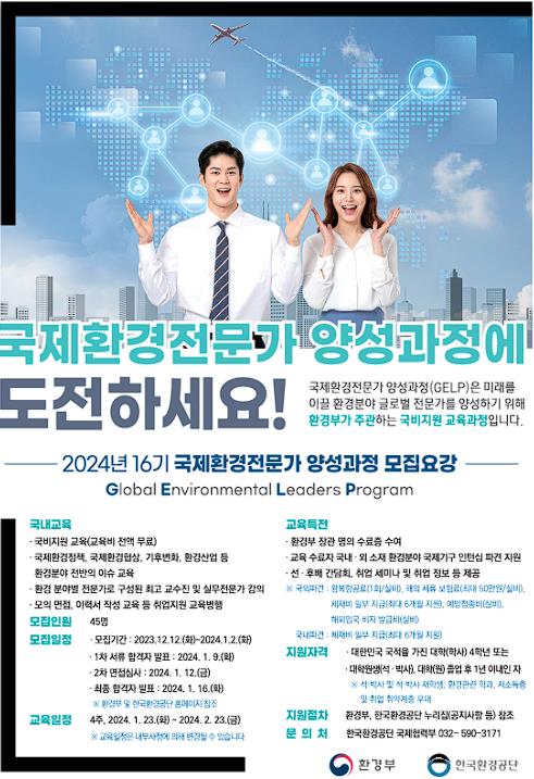 [디지털비즈온 이은광 기자] 환경부 산하 한국환경공단(이사장 안병옥)은 ‘2024년 국제환경전문가 양성과정’ 교육생을 ‘23년 12월 12일부터 ’24년 1월 2일까지 모집한다.