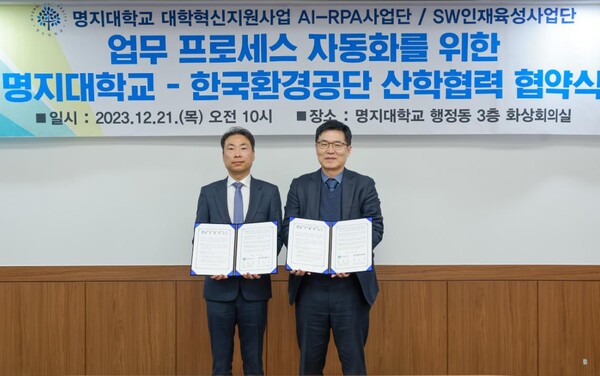 이번 업무협약은 환경서비스 프로세스 자동화와 지능화 확대를 추진하고 있는 공단과 AI-RPA 사업단 운영 등 업무자동화 분야 전문성을 갖춘 명지대학교와 상호 협력하는 것이 골자다.