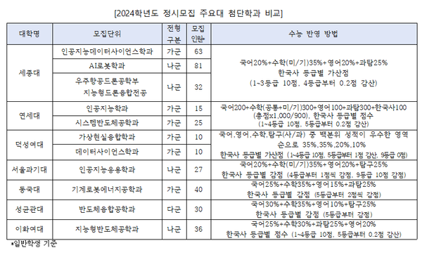 2024학년도 신설·증원된 대학별 첨단학과의 정시모집 현황은 아래 표와 같다.