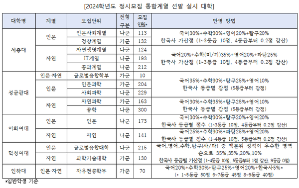 세종대를 포함한 일부 대학은 정시모집에서 통합계열 선발을 시행한다. 성균관대와 이화여대, 덕성여대는 일부 학과·전공을 제외하고 계열별 선발을 시행하며, 인하대는 인문·자연 계열의 구분 없이 전공 선택이 가능한 자유전공학부에서 70명을 선발한다.