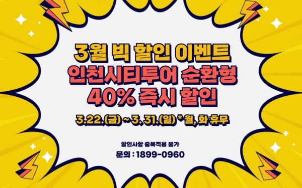 [디지털비즈온 이은광 기자] 인천광역시(시장 유정복)와 인천관광공사(사장 백현)는 이용객 대상 만족도 조사 및 유관기관 등의 의견을 적극 수렴하여 3월에 신규 관광지 등을 포함 인천시티투어 노선을 개편하고 다양한 프로모션을 추진한다고 밝혔다.