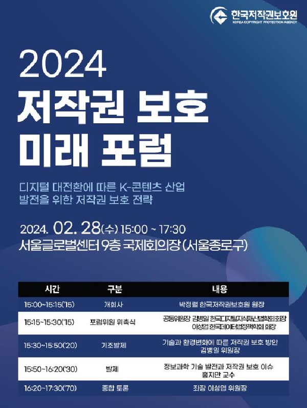 [디지털비즈온 이현주 기자] 한국저작권보호원(원장 박정렬, 이하 보호원)은 2월 28일 서울글로벌센터 국제회의장에서 제1회 ‘2024 저작권 보호 미래 포럼’을 개최한다.