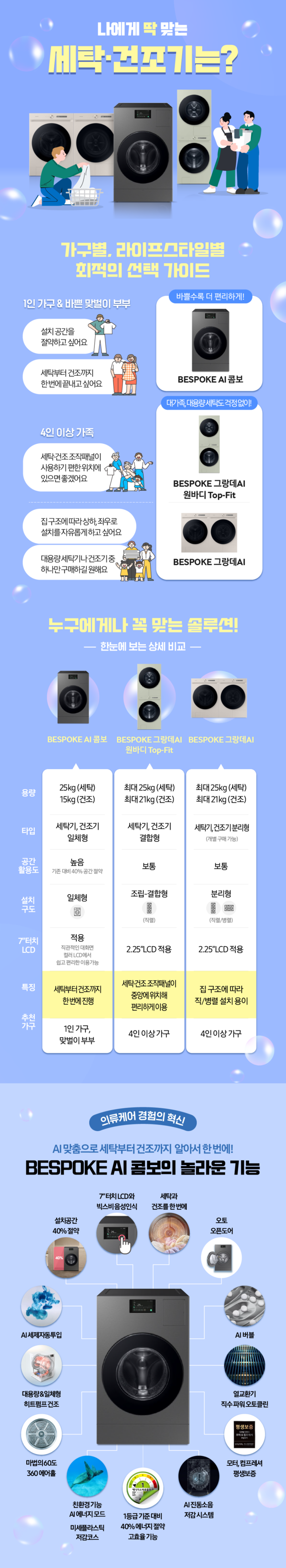 국내 최대 용량에 세탁과 건조를 한 번에 해주는 기능으로 출시 3일 만에 판매량 1천 대를 돌파한 ‘비스포크 AI 콤보’부터 세탁∙건조 조작 패널을 중앙에 배치해 사용하기 편리한 ‘비스포크 그랑데 AI 원바디 Top-Fit’, 그리고 집 안 구조에 따라 상하, 좌우 원하는 대로 배치할 수 있는 ‘비스포크 그랑데 AI’ 등 소비자는 라이프스타일에 따라 세탁∙건조기를 선택할 수 있다.