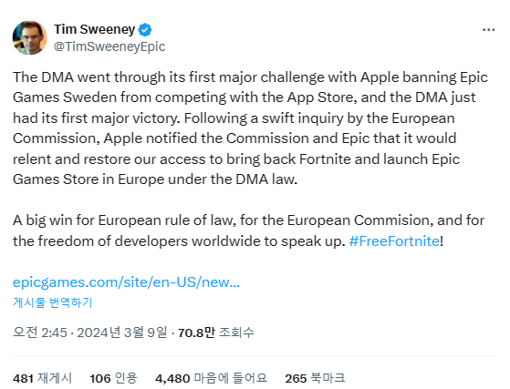 대변인은 CNBC와의 인터뷰에서 "에픽과의 대화 결과, 우리는 에픽의 DMA 정책을 포함한 규칙을 준수하기로 약속했다"며 "이에 따라 에픽 스웨덴 AB는 개발자 계약을 다시 체결하고 애플 개발자 프로그램에 참여할 수 있게 됐다"고 말했다.