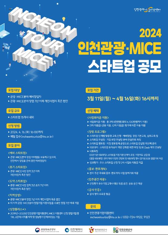 [디지털비즈온 이은광 기자] 인천광역시(시장 유정복)와 인천관광공사(사장 백현)는 관광‧MICE분야 창업 및 기업육성 지원을 위한 ‘2024 인천 관광‧MICE 스타트업을 공모’를 3월 11일(월)부터 4월 16일(화)까지 실시한다고 밝혔다.