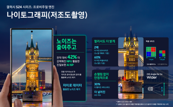 이때 갤럭시 S24 울트라의 더 강력해진 나이토그래피 기능을 통해 어두운 곳에서도 고품질 이미지를 촬영할 수 있다. 그리고 갤럭시 S24 울트라에 탑재된 5배줌 센서 크기는 약 24.47mm2로, 이전 시리즈의 10배줌 센서 크기인 약 12.52mm2보다 약 2배 커져 멀리 있는 피사체를 더욱 선명하게 촬영할 수 있다.