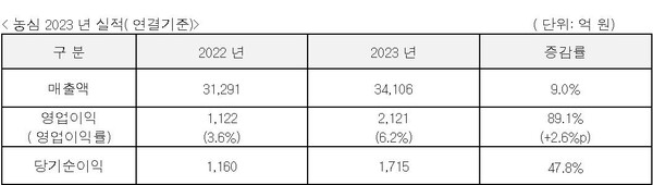 [디지털비즈온 이현주 기자] 농심은 2023년 연결기준 매출액 3조 4106억원, 영업이익 2121억을 기록했다고 14일 공시했다. 전년 대비 매출액은 9.0%, 영업이익은 89.1% 증가한 수치다. 영업이익률은 6.2%를 기록했다.