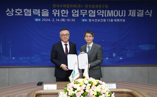 한국수력원자력(사장 황주호, 이하 한수원)이 14일 서울 한수원 방사선보건원에서 한국법제연구원(원장 한영수)과 ʻ원전 분야 법제 협력 및 공동연구 활성화를 위한 업무협약ʼ을 체결했다.