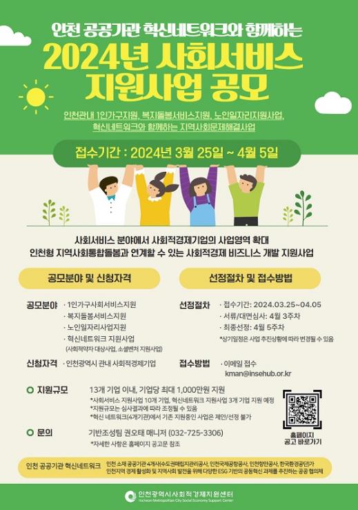 3월 25일부터 4월 5일까지 공모가 진행되며, 인천광역시 관내 사회적경제 기업이면 신청할 수 있다. 공모 분야는 1인 가구 사회서비스 지원을 비롯해 복지 돌봄, 노인 일자리, 소셜벤처 지원사업 등으로, 혁신네트워크 공동기금을 활용해 기업 당 최대 1,000만 원까지 지원된다.