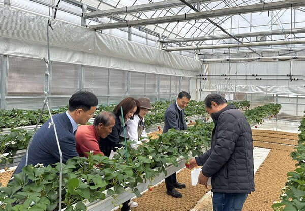 한국수자원공사(K-water, 사장 윤석대)는 26일 수질 개선 등 지속 가능한 댐 물 환경 공간 선도를 위해 조성한 전라북도 진안군 안천면 소재 용담댐 탄소제로 생태마을 스마트팜에서 재배작물 나눔 행사를 개최했다. 이번 행사는 스마트팜 첫 수확물로 선정된 딸기를 재배하여 마을회 주민들에게 전달하기 위해 마련되었다.