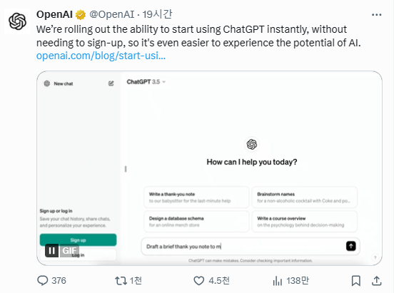 오픈AI는 월요일(4월 1일)부터 사용자가 챗GPT를 사용하기 위해 가입하거나 로그인해야 하는 요건을 없앤다고 밝혔다. 회사는 업데이트를 점차 진행하기 시작할 것이라고 말했지만 모든 사람에 대해 가입 요구 사항이 언제 해제될지는 밝히지 않았다. 사용자는 원한다면 여전히 계정을 만들 수 있다고 말했다.