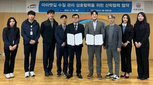 이날 협약식에는 세종대 환경에너지공간융합학과 노준성 교수, 허진 교수, 이윤경 교수, 오해성 연구원과 수자원공사 아라뱃길지사 김지웅 지사장, 박용석 부장, 정재중 차장, 유민영 과장, 정헌재 대리, 김채린 대리 등이 참여했다.