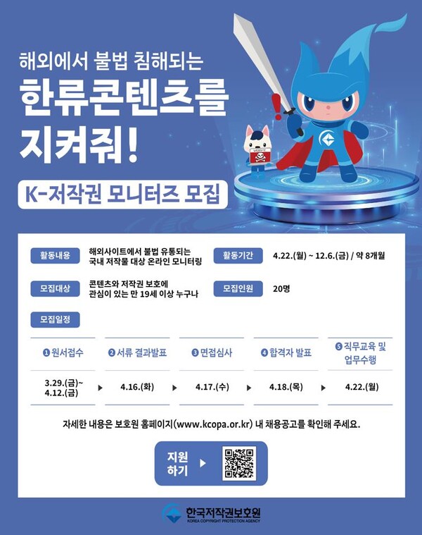 [디지털비즈온 이은광 기자] 한국저작권보호원(원장 박정렬, 이하 보호원)에서 해외사이트를 통한 저작권 침해 확산에 대응하기 위해 ‘K-저작권 모니터즈(이하 모니터즈)’를 모집한다.