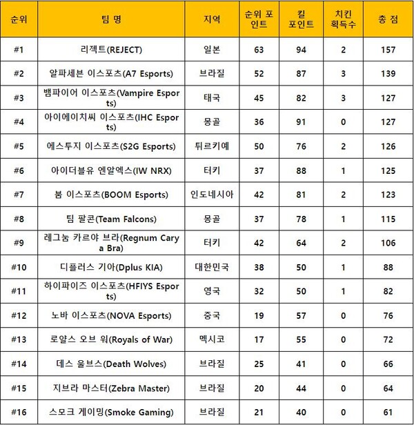 한국 대표 자격으로 출전한 디플러스 기아는 10위로 대회를 마감했다. 대대적으로 팀을 개편한 이후에 치른 첫 국제 대회였던 만큼 2일 차까지 13위로 부진했지만, 마지막 날 1치킨과 함께 43점을 획득하며 유종의 미를 거뒀다.