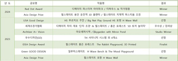 지난 2월 ‘아시아 디자인 프라이즈 2024’에서 힐스테이트 용인 둔전역의 ‘H 아이 플랜터(H Eye Planter)’와 힐스테이트 지제역 퍼스티움의 조경경관이 위너로 선정됐다. 이로써 아시아 디자인 프라이즈에서 3년 연속 수상했다. 특히 3D 프린팅 기술을 적용한 ‘H 아이 플랜터’가 수상하며 3D 프린팅 조경작품으로는 4년 연속 수상이라는 기록도 세웠다.