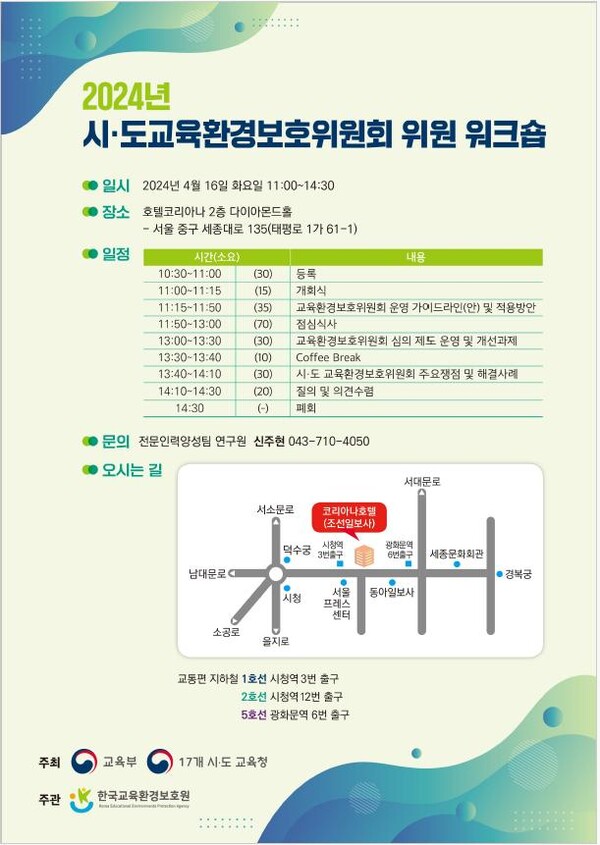 [디지털비즈온 이은광 기자] 교육부 및 전국 시‧도교육청이 주최하고 한국교육환경보호원(원장 조명연, 이하 보호원)이 주관하는 “2024년 시·도교육환경보호위원회 위원 워크숍”이 4월 16일(화)에 호텔 코리아나에서 오프라인으로 개최된다.