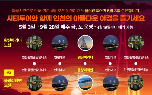 [디지털비즈온 이은광 기자] 인천광역시(시장 유정복)와 인천관광공사(사장 백현)는 인천시티투어의 2층 버스로 운행되는 노을야경투어를 5월부터 재개한다고 밝혔다.