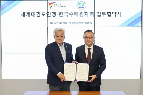 한국수력원자력(사장 황주호, 이하 한수원)은 세계태권도연맹(총재 조정원, 이하 연맹)과 9일 서울 소재 연맹 본부에서 원전 수출 지원 문화교류 활동을 위한 업무 협약을 체결했다.