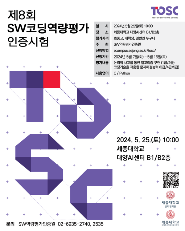 [디지털비즈온 이현주 기자] 세종대학교(총장 배덕효) 산학협력단 SW역량평가인증원은 오는 5월 25일(토) 오전 10시 세종대학교 대양AI센터에서 제8회 SW코딩역량평가(Test Of Software Coding, TOSC, 이하 ‘토스크’)를 개최한다.