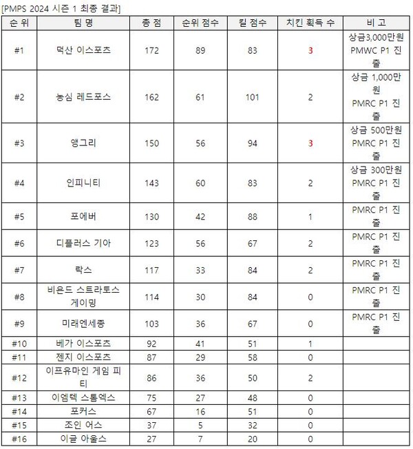 하루 6매치씩 총 18매치를 진행하며 초박빙의 선두 경쟁 끝에 PMPS 2024 시즌 1 최종 우승은 총 3치킨, 172포인트를 획득한 덕산 이스포츠가 차지했다.