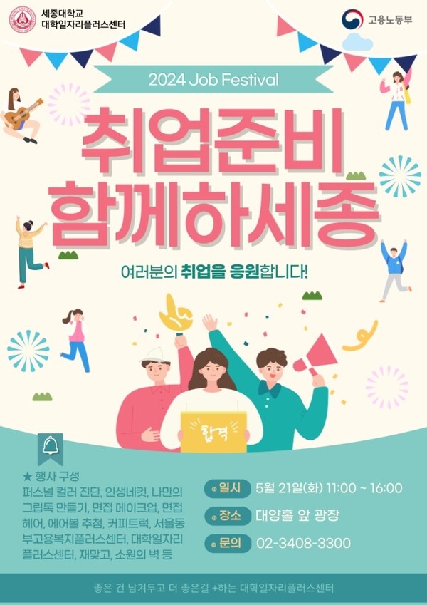[디지털비즈온 이현주 기자] 세종대학교(총장 배덕효) 대학일자리플러스센터는 오는 5월 21일(화)에 구직활동자의 취업 역량 강화를 위해 잡페스티벌 ‘2024 취업준비 함께하세종’을 진행한다.