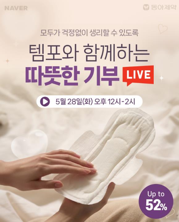[디지털비즈온 이현주 기자] 동아제약(대표이사 사장 백상환)은 5월 28일 세계 월경의 날을 맞아 ‘템포와 함께하는 따뜻한 기부’ 라이브 방송을 진행한다고 28일 밝혔다.