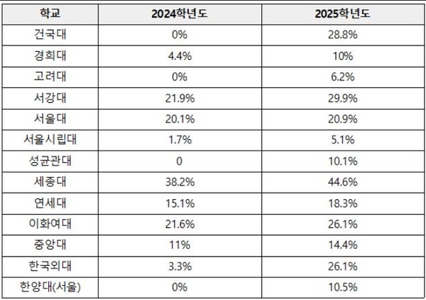2024학년도의 수치와 비교해 보면 세종대는 작년 774명이었던 무전공 선발인원을 930명으로 늘려 선발 비율이 6.4%p 증가했다. 이외에도 서강대는 8%p, 건국대 28.8%p, 경희대 5.6%p 증가했다.