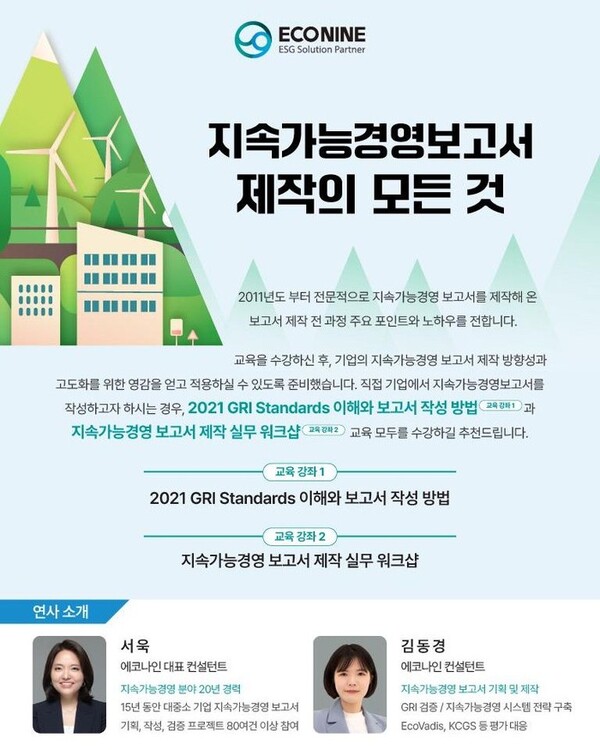 [디지털비즈온 이은광 기자] ESG(환경·사회·지배구조)경영 자문 컨설팅 기업 에코나인이 오는 20일 기업 대상 “지속가능경영보고서 제작의 모든 것” 교육 시리즈를 오프라인으로 실시한다. 이번 교육 시리즈는 “2021 GRI Standards 이해와 보고서 작성 방법”과 “지속가능경영보고서 제작 실무 워크샵” 교육강좌로 구성되어 있다.