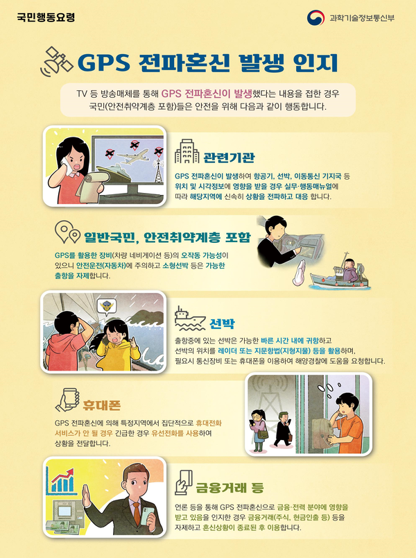 과기정통부는 GPS 전파혼신 위기경보 “주의” 단계를 유지하면서 국토부, 해수부 등 관계부처와 긴밀한 공조를 통해 실제 피해가 발생하지 않도록 항공기 지상항법시설・관성항법장비 사용, 선박 레이더・항로표지・지형지물 활용 등 예방조치를 수행하는 등 비상대비 체계를 운영하고 있다고 밝혔다..