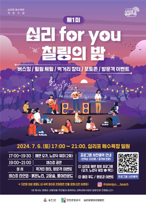 [디지털비즈온 이은광 기자] 옹진군(군수 문경복), 인천관광공사(사장 백현)는 오는 7월 6일 영흥도 십리포 해수욕장에서 내동마을 주민과 함께하는 「제1회‘십리 for you’칠링의 밤」 마을축제를 개최한다고 밝혔다.